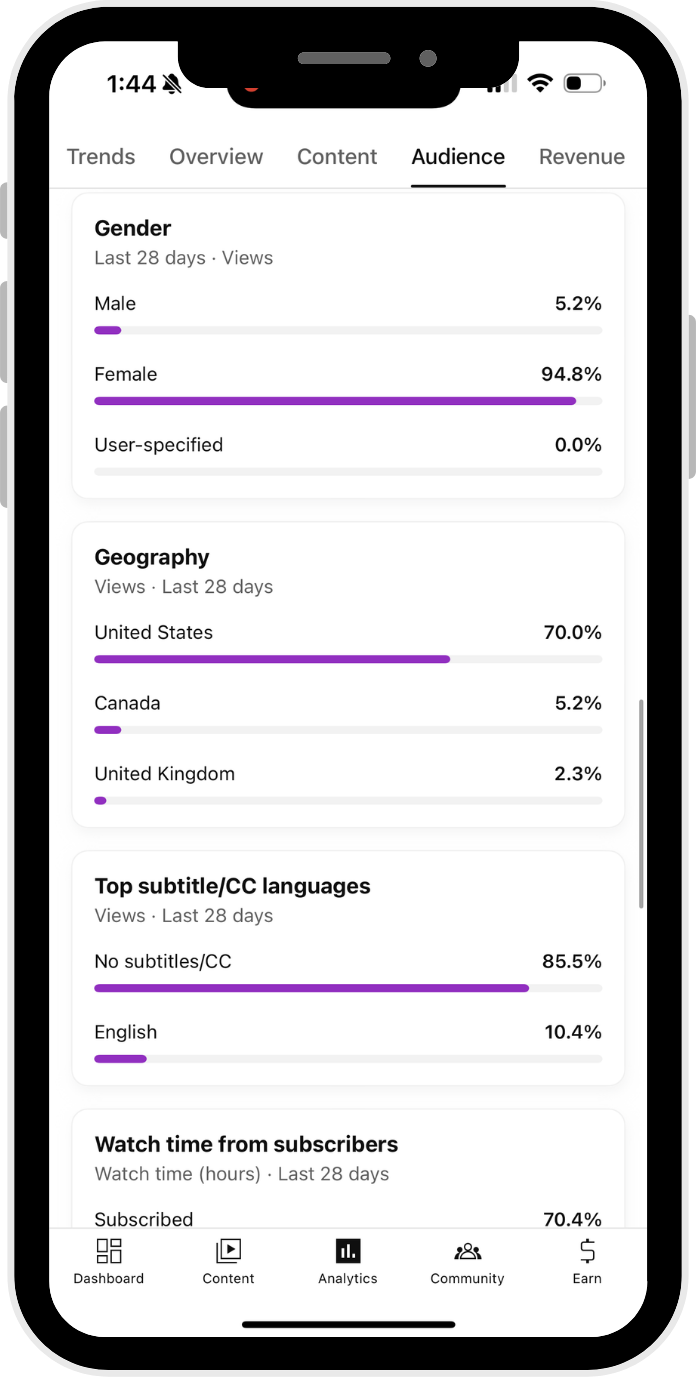 vs. new viewers, top geographies, age and gender, and when your audience is most