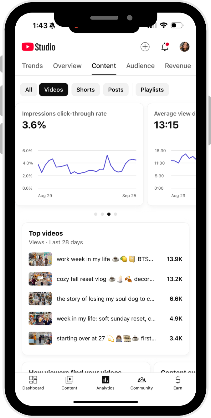 - In the app, tap Analytics at the bottom. Here you’ll see a full overview of your channel’s performance.