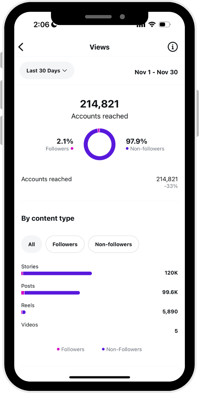 - Content type: Posts, Reels, Stories, Videos, Lives